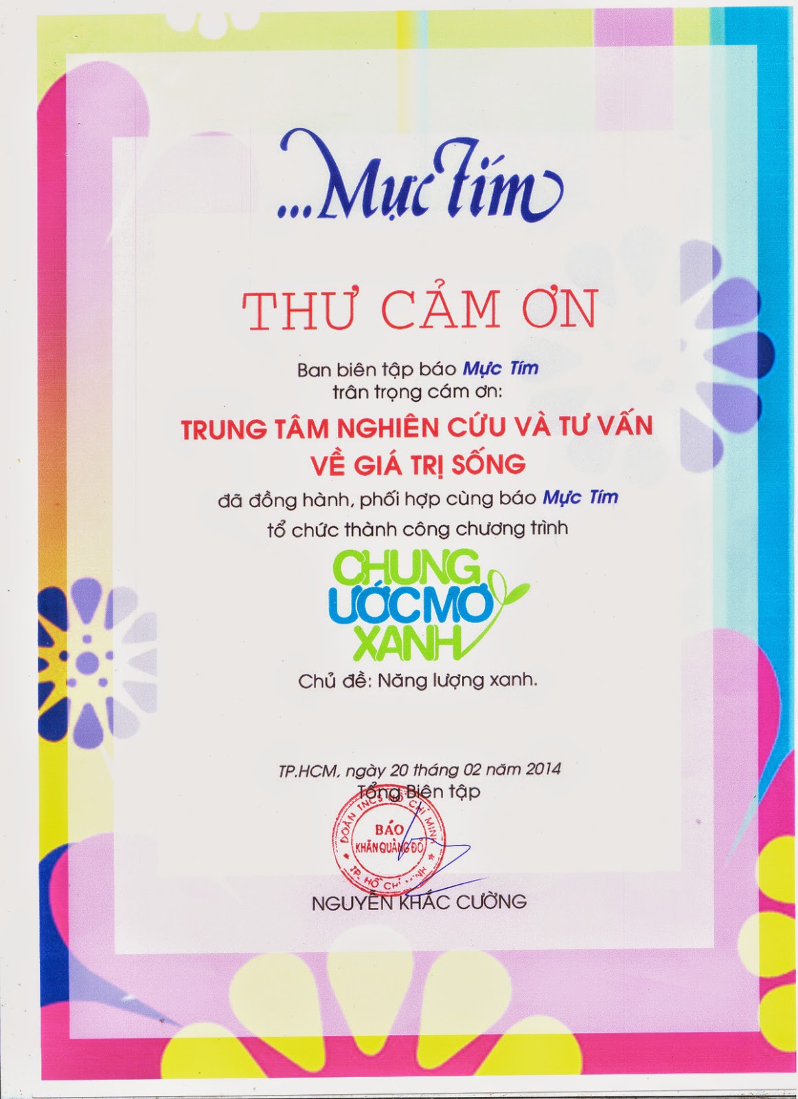 Thư cám ơn của Trung tâm Tư vấn & Cai nghiện MT Làng Bình Minh